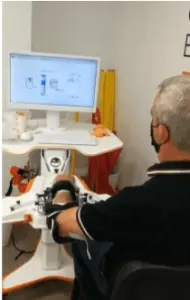 Por ello, y previo acuerdo con J. y su familia, decidimos implementar un protocolo de CIMT acompañado de terapia asistida por robótica (AMADEO). Se realiza el protocolo tradicional de 2 semanas, llevando la restricción física (venda/guante) un 90% del tiempo que pasa despierto. Durante el mismo, realizamos diferentes actividades exigentes y repetitivas para trabajar de manera intensiva la mano izquierda, con el fin de conseguir su mayor potencial y así poder lograr los objetivos planteados (coger y beber de un vaso de agua con la mano izquierda, realizar el swing con el palo de golf de manera correcta y efectiva, ponerse los calcetines, uso de los cubiertos, abrochar botones, ponerse las gafas…).