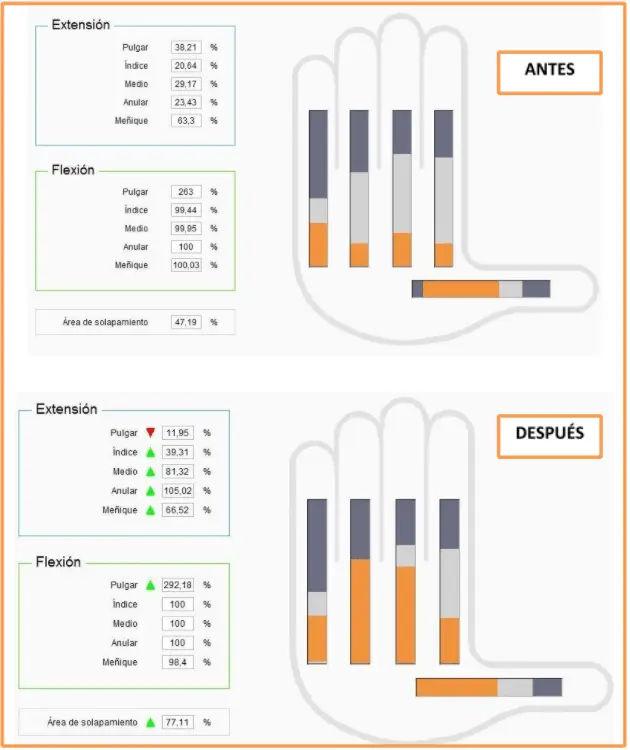 Resultados de evaluación (antes y después del tratamiento) de la movilidad de los dedos durante el cierre y la apertura de la mano a través de AMADEO.