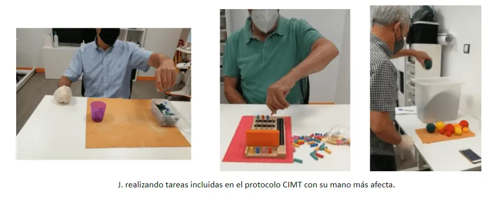 Realizando tareas incluidas en el protocolo CIMT con su mano más afecta.